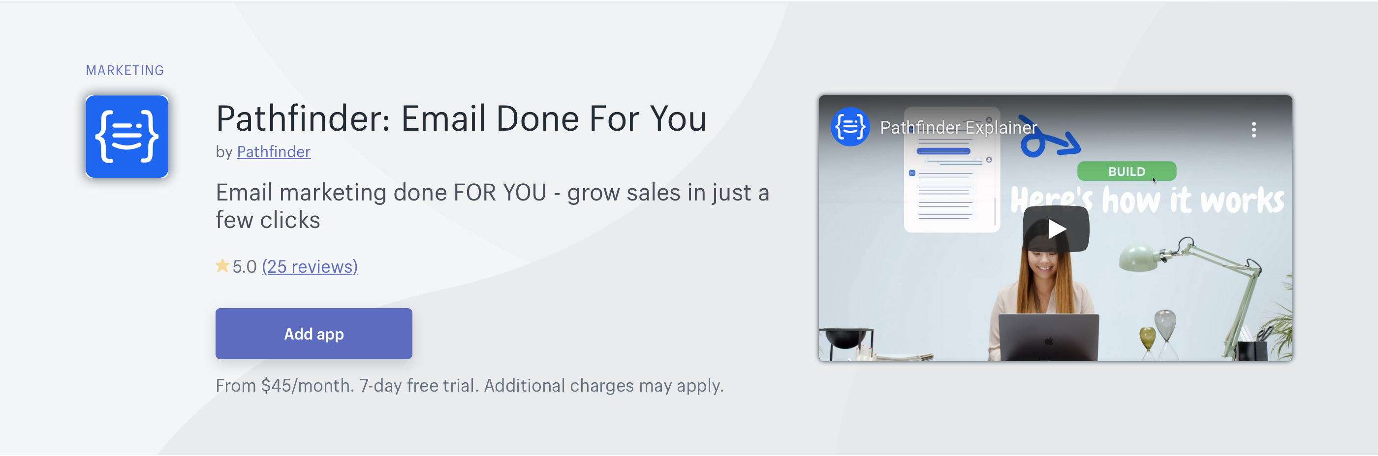 Pathfinder is an email marketing app that takes care of a range of marketing tasks for your Shopify store. It handles the whole process of writing, creating and scheduling emails for campaigns that will increase purchases and achieve results.