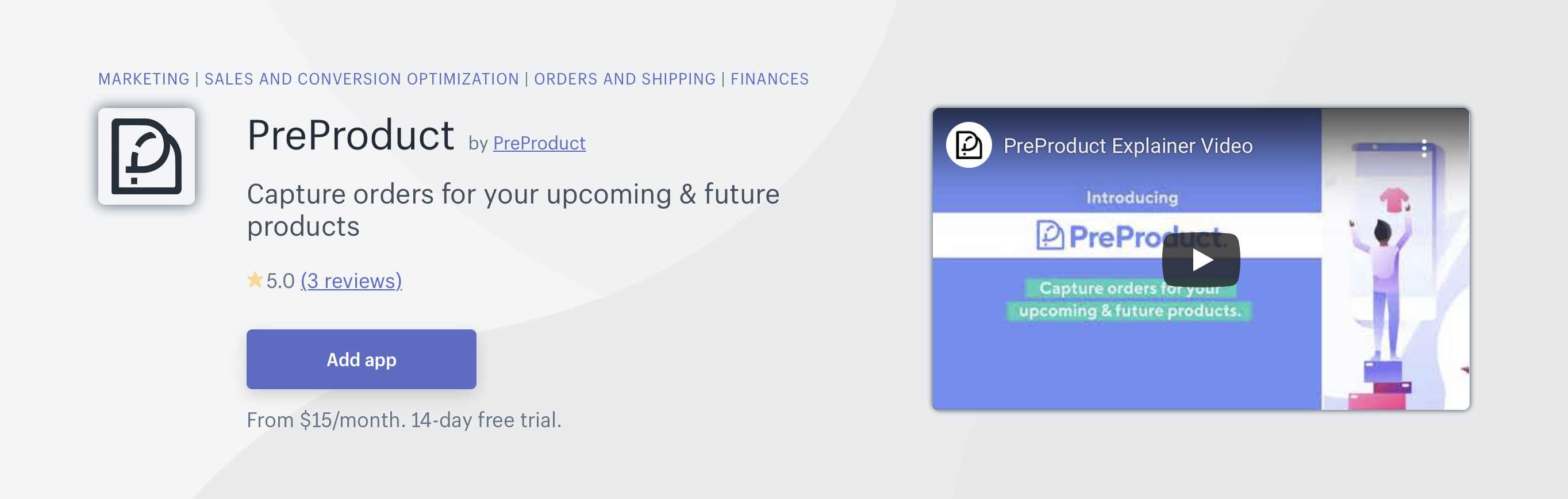 The PreProduct app enables Shopify store owners to collect orders for future and upcoming products.